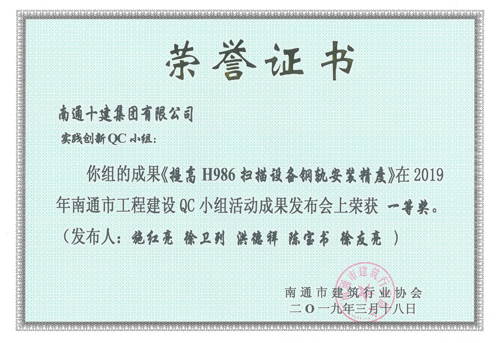 更好地总结交流一年来我市工程质量管理活动的成绩和经验,提高全市建筑企业科技创新能力和工程创优水平,进一步促进全市工程建设QC小组活动上新台阶。南通市建筑行业协会于3月18日召开南通市工程建设优秀质量管理小组活动成果交流发布会。这次共评出265项获奖成果,其中一等奖42项、二等奖67项、三等奖104项、优秀奖52项。在发布会上,南通十建实践创新QC小组申报的成果“提高H986扫描设备钢轨安装精度”喜获一等奖。